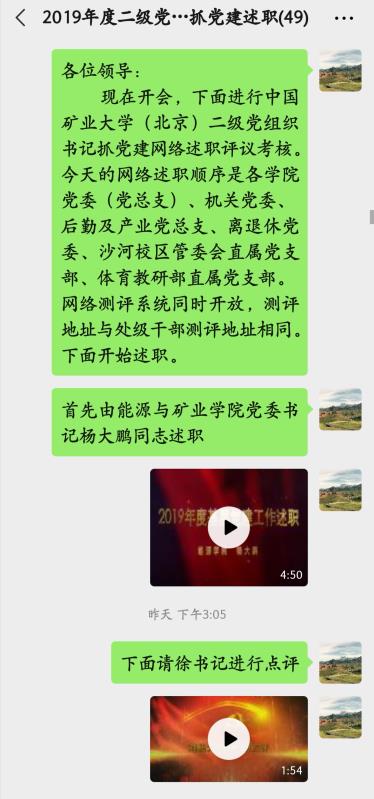 本次述职评议考核综合考虑疫情防控实际和上级工作要求,创新工作方式,以微信线上视频述职形式进行。能源与矿业学院党委书记杨大鹏等15名二级党组织书记,围绕履行党建主体责任情况,从加强党的政治建设、开展“不忘初心、牢记使命”主题教育、落实意识形态工作责任制等方面,汇报了工作中取得的主要成绩、存在问题和不足,以及下一步工作思路。