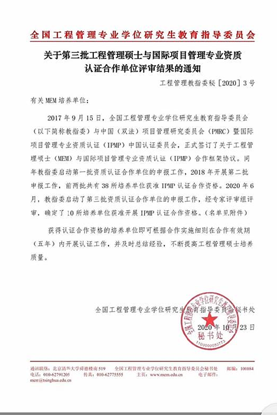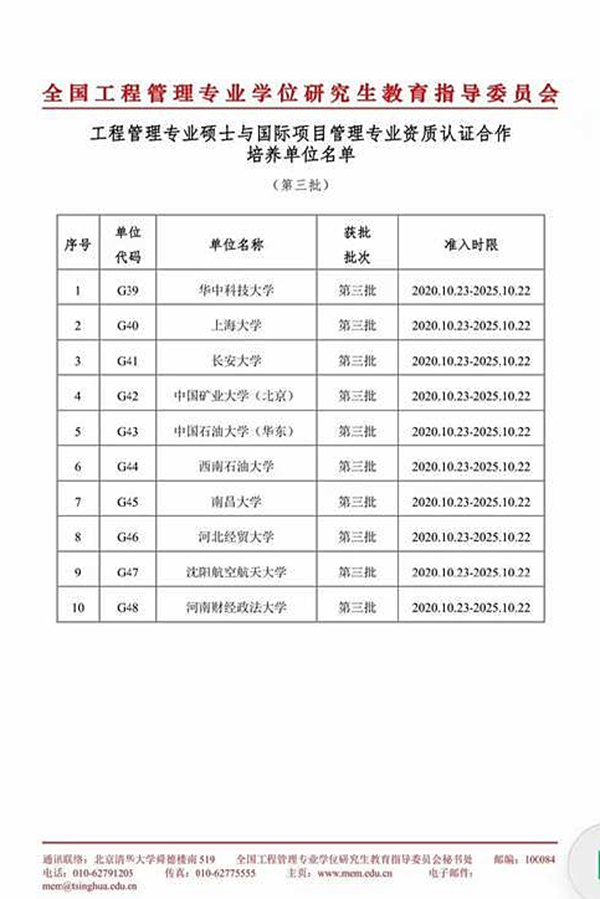 本网讯 10月23日,全国工程管理专业学位研究生教育指导委员会公布了《关于第三批工程管理硕士与国际项目管理专业资质认证合作单位评审结果的通知》(工程管理教指委秘[2020]3号),中国矿业大学(北京)通过专家评审组评审,成为工程管理硕士与国际项目管理专业资质(IPMP)认证合作培养单位,管理学院MBA教育中心的工程管理硕士(MEM)获准开展IPMP认证合作资格。第三批获准开展国际项目管理专业资质认证(IPMP)合作资格的高校共有10所,我校是本批唯一获得该认证合作资格的北京高校,也成为目前全国48所,北京6所获准开展IPMP认证合作的高校之一。