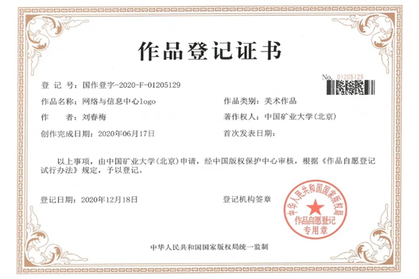本网讯 2020年12月18日,我校“网络与信息中心LOGO”设计作品通过中国版权保护中心审核,在国家版权局登记,获得著作权保护,并授权中国矿业大学(北京)使用。