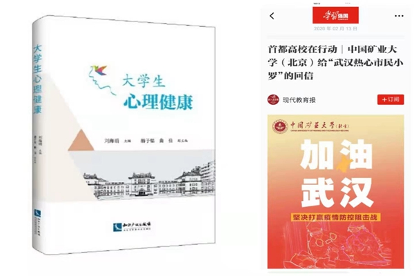 2020年心理健康教育咨询中心与万千师生携手共同抗击疫情,将线上与线下工作相结合,开展了大量质量高、针对性强的心理健康教育工作。中心在官方微信公众号开辟“矿洞•心晴”专题,推送101期抗疫主题的心理健康知识文章,其中《给“武汉热心市民小罗”的回信》一文被学习强国、现代教育报等媒体转载;多次开展心理排查和心理普查工作,为重点学生提供一对一的心理咨询服务;针对学生家长、辅导员、宿舍管理员以及不同年级的学生,举办多种类型的培训会、宣讲会,切实增强心理健康宣传教育工作的实效性;组织开展5•25大学生心理健康节、新生心理素质拓展等学生喜爱的心理活动,提升学生的心理适应能力。中心还在疫情期间组织专职教师和7名辅导员一起编写《大学生心理健康》校本教材,使我校的心理课堂教学更为贴近我校学生实际,提升课堂教学效果。