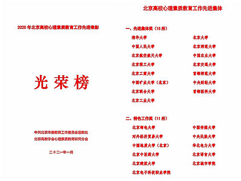 我校被评为2020年北京市心理素质教育先进单位