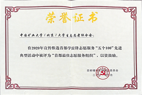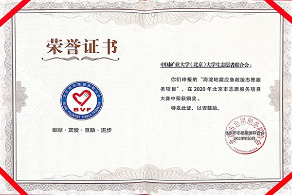 本网讯 为大力培育和践行社会主义核心价值观,弘扬“奉献、友爱、互助、进步”的志愿精神,进一步推进学雷锋志愿服务制度化常态化,首都文明委组织开展了宣传推选2020年度首都学雷锋志愿服务“五个100”先进典型活动,我校大学生志愿者联合会荣获“首都最佳志愿服务组织”。同时,在2020年北京市志愿服务项目大赛中,我校大学生志愿者联合会海淀地震应急救援志愿服务项目于申报参赛的346个志愿服务项目中脱颖而出,荣获“2020年北京市志愿服务项目大赛铜奖”。