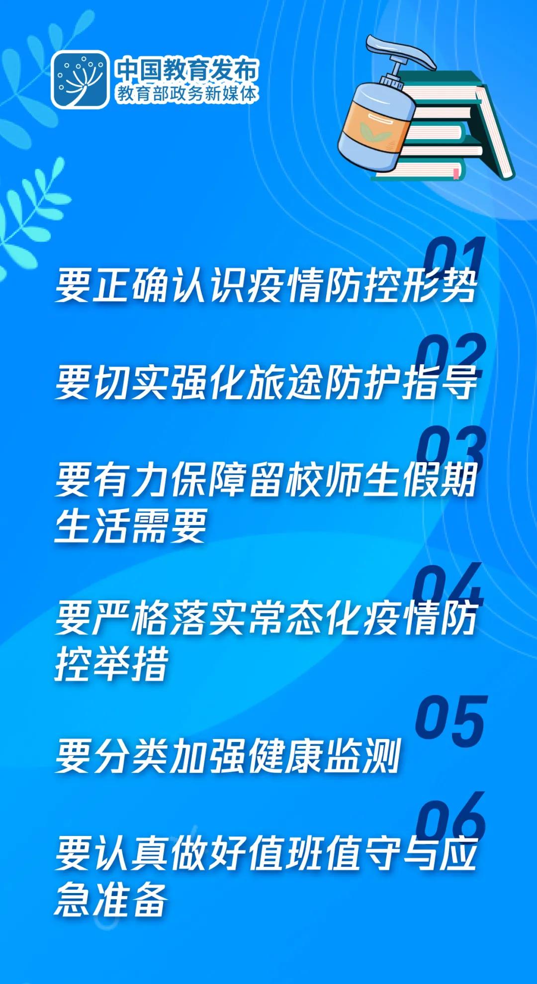 通知强调,要切实强化旅途防护指导。各地教育部门和学校要教育引导师生遵守学校所在地和出行目的地疫情防控规定,践行勤洗手、常通风、戴口罩、少聚集等公民防疫基本行为准则。多形式多渠道教育引导师生做好旅途防护,主动配合交通场站做好体温检测、查验“健康码”等防控措施,乘坐交通工具时全程戴口罩。