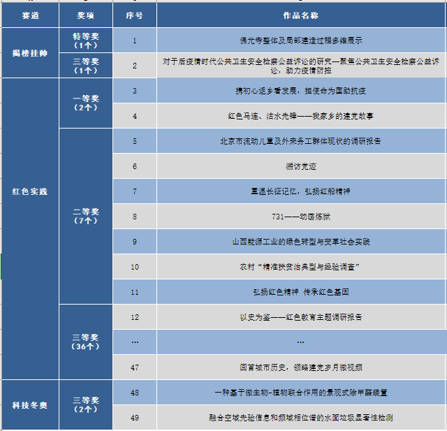在“红色实践”、“科技冬奥”、“揭榜挂帅”三个专项赛中,我校共推荐49项优秀作品参赛,全部获奖,其中荣获“揭榜挂帅”专项赛特等奖1项,“红色实践”专项赛一等奖2项、二等奖7项、三等奖36项,“科技冬奥”专项赛三等奖2项。