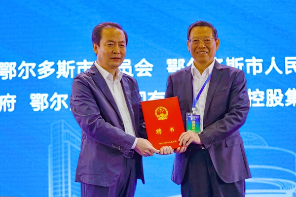 鄂尔多斯市委副书记、代市长杜汇良向中国科学院院士、中国矿业大学(北京)何满潮教授颁发聘书