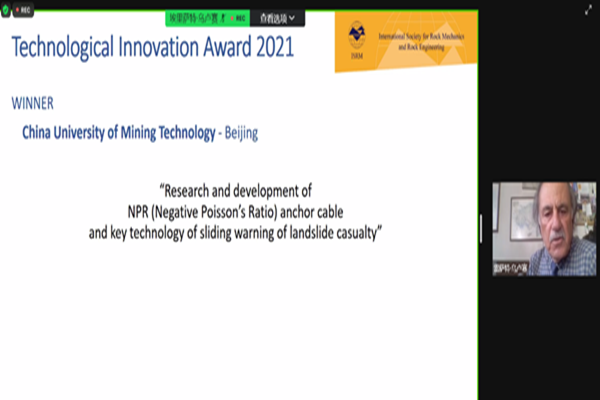 同时,在此次颁奖典礼上,何满潮院士团队自主研发的NPR锚索材料和滑坡灾害牛顿力远程监测预警关键技术荣获了2021年度ISRM技术发明奖(ISRM Technological Innovation Award 2021)。ISRM技术发明奖是由ISRM主席团于2019年设立的,旨在授予对应用岩石力学和岩石工程的发展做出突出贡献的ISRM团体会员。此次颁奖是该奖项的首届授奖,何满潮院士团队是荣获该奖项的首个获奖团体。