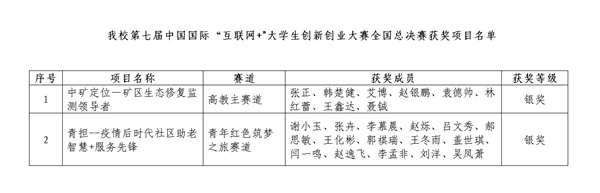 本网讯 第七届中国国际“互联网+”大学生创新创业大赛全国总决赛于10月12日-15日在南昌大学举行,经过激烈角逐中国矿业大学(北京)“中矿定位—矿区生态修复监测领导者”和“青担--疫情后时代社区助老智慧+服务先锋”两个项目斩获全国总决赛银奖。