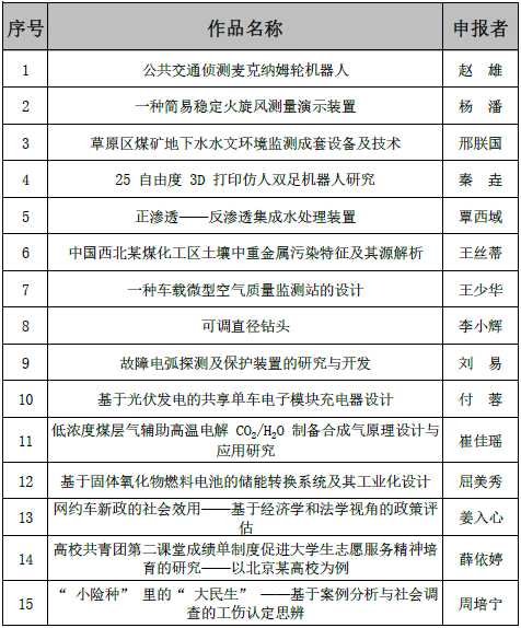 校内选拔赛自2016年12月拉开帷幕以来,得到了学校领导和相关职能部门、教学单位负责同志的高度重视。经各学院的宣传筹备、组织申报等程序全校共提交108项作品,经院团委初审遴选上交78项作品,经12位具有高级专业技术职称的评审专家审核,最终有32项作品进入决赛角逐。其中自然科学类作品6项,科技发明制作类作品14项,哲学社科类类作品12项。