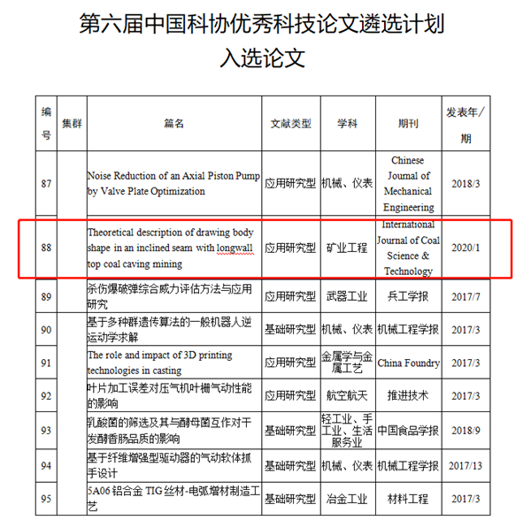 本网讯 近日,中国科协发布了第六届中国科协优秀科技论文遴选计划入选论文名单,我校能源与矿业学院王家臣、魏炜杰、张锦旺于2020年在期刊《International Journal of Coal Science & Technology》发表的《Theoretical description of drawing body shape in an inclined seam with longwall top coal caving mining》一文成功入选。