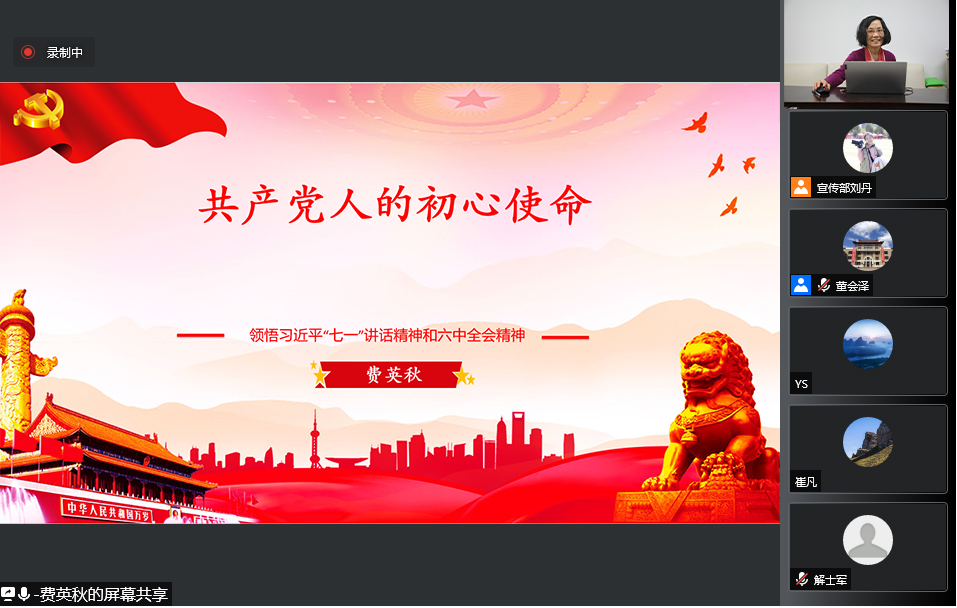 费英秋教授以十九届六中全会公报中鲜明指出的“全党要牢记中国共产党是什么、要干什么这个根本问题”为引言,围绕实现中华民族伟大复兴的伟大梦想和以人民为中心的战略构想的伟大工程,探讨了中国共产党人的初心使命。