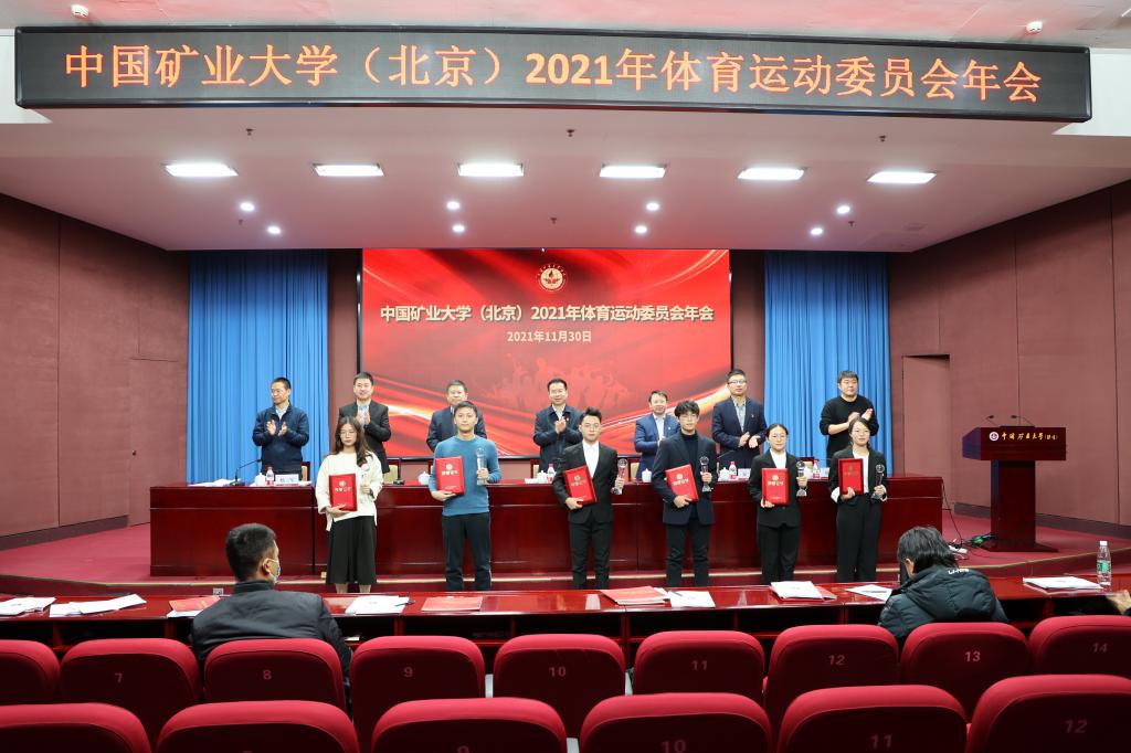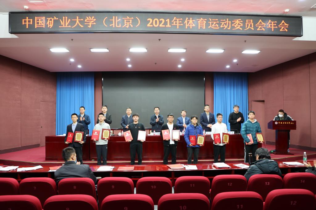 会议表彰了2021年体育工作学生优秀集体及优秀个人。教务处处长郭东明宣读年度体育先锋、优秀、优良班级名单,研究生院常务副院长徐志强宣读年度学生优秀体育干部名单,学生工作处处长安宇宣读年度体质健康测试优秀个人名单,校团委书记孙铭晗宣读年度体育优秀社团名单,体育教研部直属党支部书记邢鹏宣读年度校园健康跑之星名单。与会领导现场为获奖集体个人代表颁发奖牌和证书。