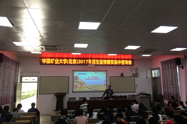 调研期间,教务处处长、招生办公室主任刘波在都安高中开展中国矿业大学(北京)2017年招生宣传咨询会。介绍了我校发展历史、校园文化、师资科研、国际交流等情况,并重点介绍了近几年在广西壮族自治区的招生情况和2017年高校专项招生计划,获得都安高中师生的热烈欢迎。