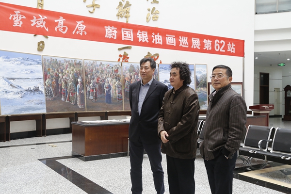 本网讯 “雪域高原-蔚国银油画作品巡展第62站”于4月11日在我校图书馆展览大厅开幕。展览开幕前,副校长王家臣来到图书馆,在油画作品前驻足观看,听取了图书馆馆长唐兵对主办本次活动的工作情况汇报,倾听了蔚国银先生的创作心路历程以及部分作品创作背后的动人故事。