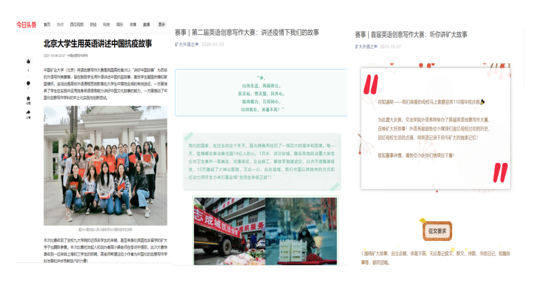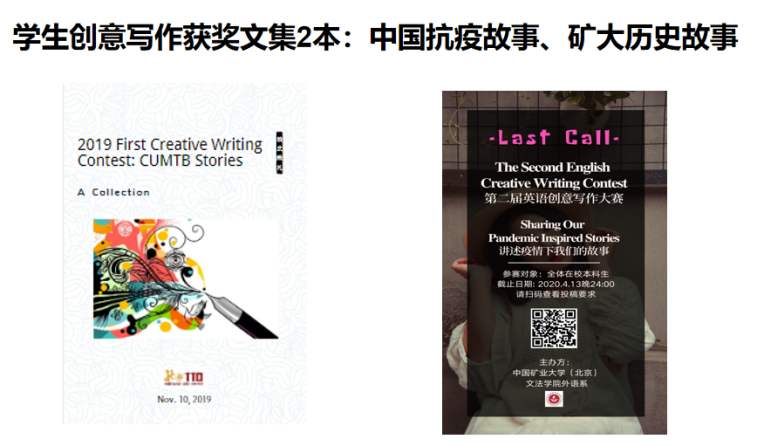自2019年以来,“用英语讲中国故事”的创意写作大赛已在中国矿业大学(北京)举办了两届,参与人数逐年升高,辐射到全校9大学院的百余名不同专业的学生,取得了丰硕的成果。百余名学生学生手写我心,文思泉涌,围绕“讲好中国故事”的主题,书写了多篇创意丰富、文采飞扬的作品,得到了校内外师生的一致好评,并在“矿大外语之声”公众号赢得了广泛的阅读和转发。更多的矿大学子积极参加各类英语竞赛,学生获奖累计多达22项,其中包括全国创意写作大赛冠军,大学生英语竞赛特等奖1名,指导全国商务英语翻译大赛一等奖4名,全国大学生英语竞赛一等奖C类7名,B类1名,全国英语写作大赛一等奖1名,二等奖1名,阅读大赛三等奖4名;全国大学生英语写作大赛优秀奖1名。更多的英语专业学生在大学生创新创业项目中也开始进行党史英译研究,习近平总书记治国理政对外翻译研究等,在实践中提升文化涵养与能力素质,加深文化自觉与自信,增强新时代青年传播中华文化、讲好中国故事的使命感。