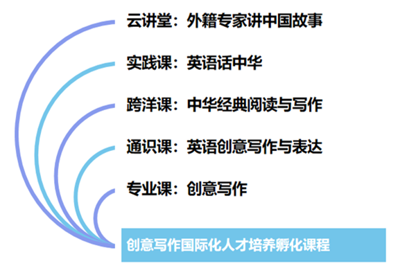 构建通识教育、专业教育、工坊实践、竞赛实践等多层次、分类别的课程体系。融合“通识课程”+“专业课程”+“国际课程”,使得本科生和硕士生参与共修实践,采取混合式教学方法,为中国文化的国际传播提供专业系统的学科训练。修订“讲好中国故事”为目标的创意写作人才培养方案,推进通识教育与专业教育的融合,贯通本硕培养,打破专业局限,拓宽学生的国际化交流平台。