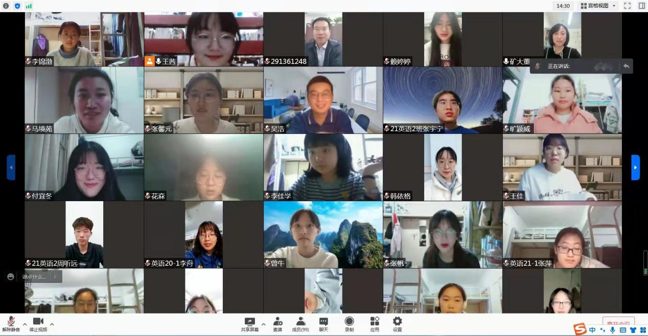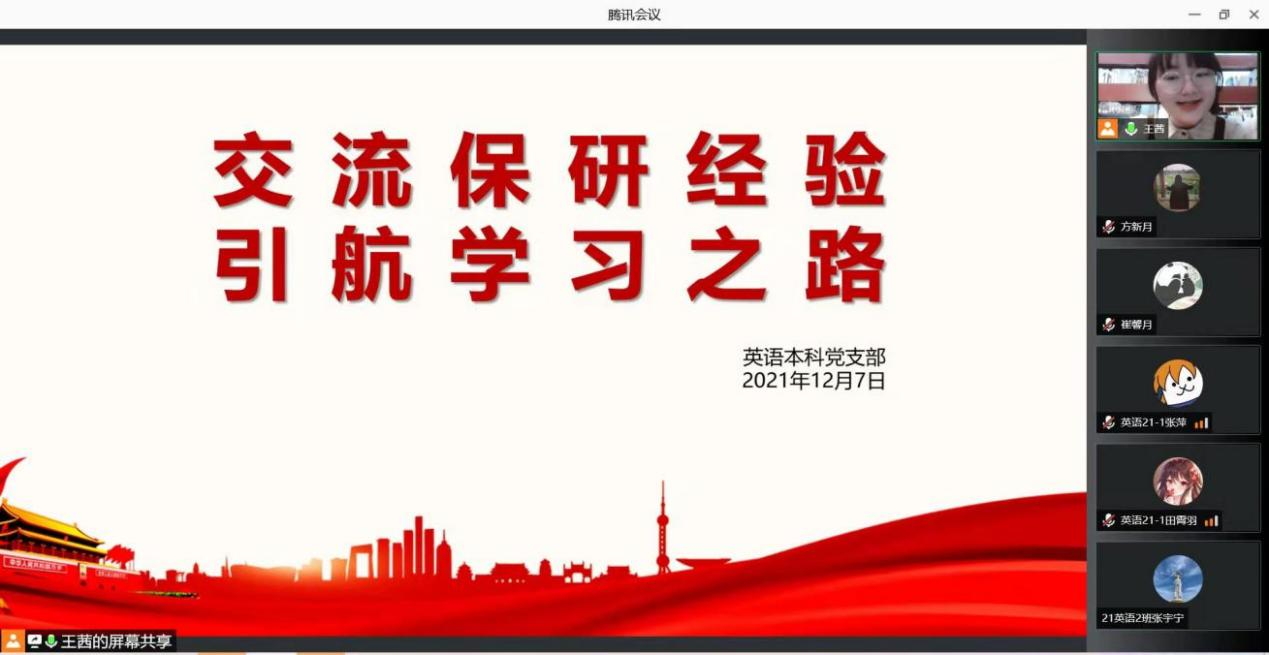 本网讯 为进一步深化党史学习教育,营造优良学风,帮助同学们了解保研流程、做好大学生涯规划,12月7日,文法学院英语本科党支部通过腾讯会议跨校区开展“交流保研经验 引航学习之路”保研交流活动。校党委副书记王忠强作为联系校领导出席本次活动并讲话,文法学院党委书记杨洪兵、学工办主任董凤姣等参加活动。学院路校区2018级、2019级,沙河校区2020级、2021级四个本科年级共计110余名学生按照疫情防控要求线上参会。