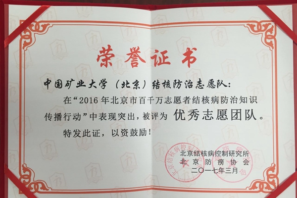 本网讯 为切实推进学校结核病防控工作,大力普及师生结核病预防知识,倡导科学防治的理念,提高全校师生对结核病防治工作的认识,中国矿业大学(北京)动员校园各方力量,成立校园结核防治志愿队,积极采取多方面有效的防控措施,积极预防结核病的发生。2016年志愿队荣获了海淀区唯一一家北京市优秀志愿团队称号。