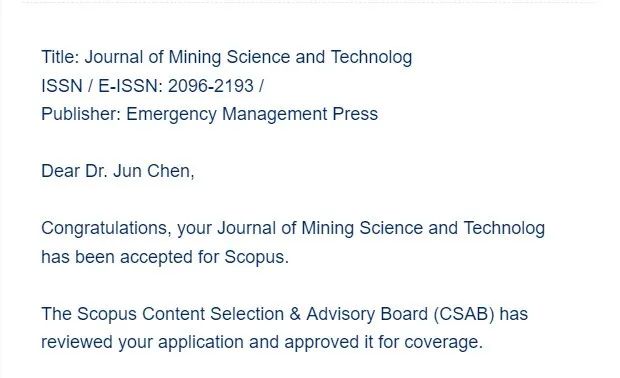 本网讯 近日,接Scopus数据库评估机构通知,《矿业科学学报》已通过“Scopus内容选择与咨询委员会”所有评审流程,正式被收录。这是《矿业科学学报》继2021年被中国科学引文数据库(CSCD)收录后,首次入选的国际重要数据库。