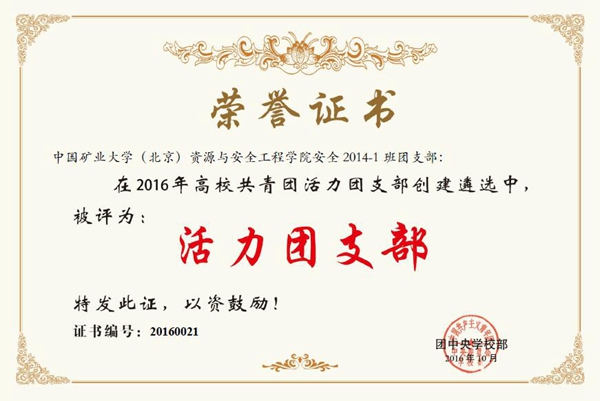 本网讯 日前,我校资源学院安全工程2014-1团支部在2016年高校共青团活力团支部创建遴选中被评为“活力团支部”。本次评选活动由团中央学校部主办,目的是贯彻中央党的全团工作会议精神,在首都高校中选树优秀基层团支部典型,推广工作经验,进一步规范团支部基本组织生活制度和巩固首都高校基层团支部建设,全面提升基层团支部活力。
