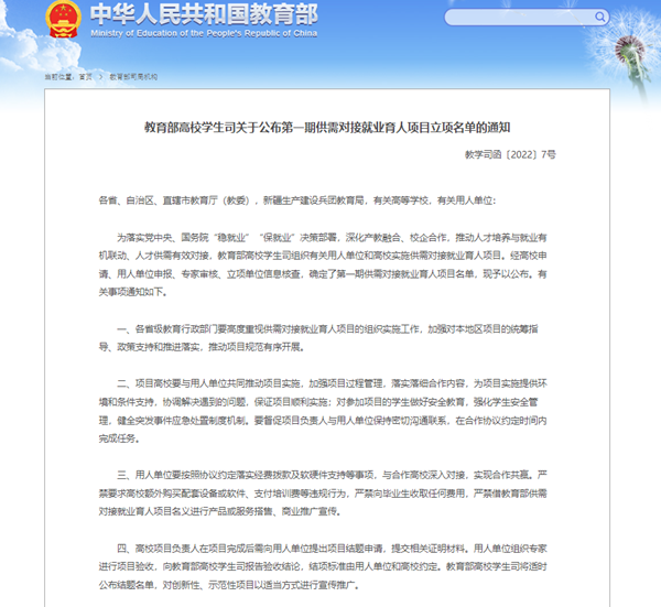 本网讯 4月2日,教育部发布了《教育部高校学生司关于公布第一期供需对接就业育人项目立项名单的通知》(教学司函〔2022〕7号),我校3个项目成功立项。