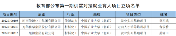 据悉,供需对接就业育人项目是教育部高校学生司为落实党中央、国务院“稳就业”“保就业”决策部署而开展的,以深化产教融合、校企合作,推动人才培养与就业有机联动、人才供需有效对接为目的的就业育人项目。我校学生工作处副处长童军武与河南能源化工集团有限公司对接的就业实习基地项目、化学与环境工程学院党委副书记姜骑山与旭阳集团有限公司对接的就业实习基地项目、化学与环境工程学院副教授曹俊雅与万华化学集团股份有限公司对接的定向人才培养培训项目顺利通过审批,获准立项。