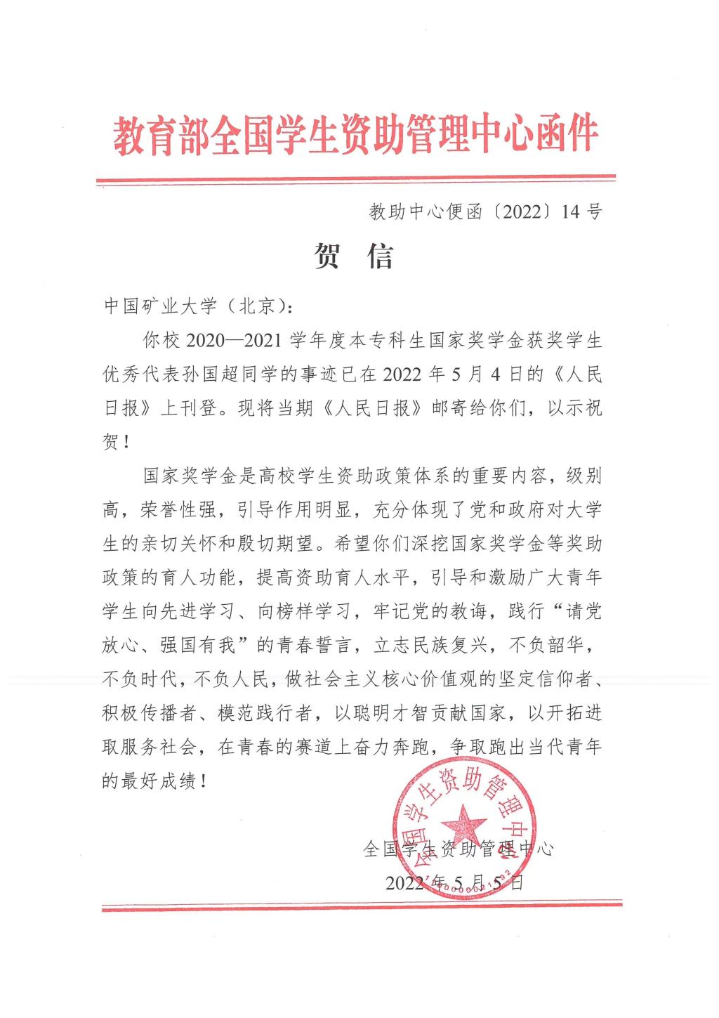 本网讯 近日,教育部全国学生资助管理中心向我校发来贺信,祝贺我校孙国超同学作为2020-2021学年度本专科生国家奖学金获奖学生代表,个人事迹在2022年5月4日的《人民日报》上刊登。