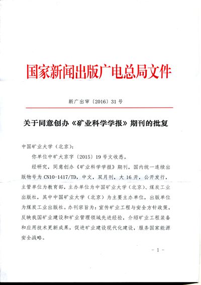 2016年1月19日,学校收到国家新闻出版广电总局《关于同意创办< 矿业科学学报>期刊的批复》,标志着我校申请创办学报期刊获得正式批准。《矿业科学学报》期刊由中国矿业大学(北京)和煤炭工业出版社联合创办。教育部为主管单位,我校为主要主办单位,煤炭工业出版社为第二主办单位和出版单位。