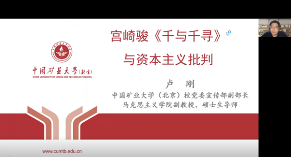 本网讯 5月17日下午,马克思主义青年读书会举办题为“宫崎骏《千与千寻》与资本主义批判”的线上讲座。学校党委宣传部副部长、马克思主义学院副教授卢刚主讲。校团委书记孙铭晗、读书会指导教师曾庆桃等校内外80余名师生线上参加活动。读书会会长张家腾主持活动。