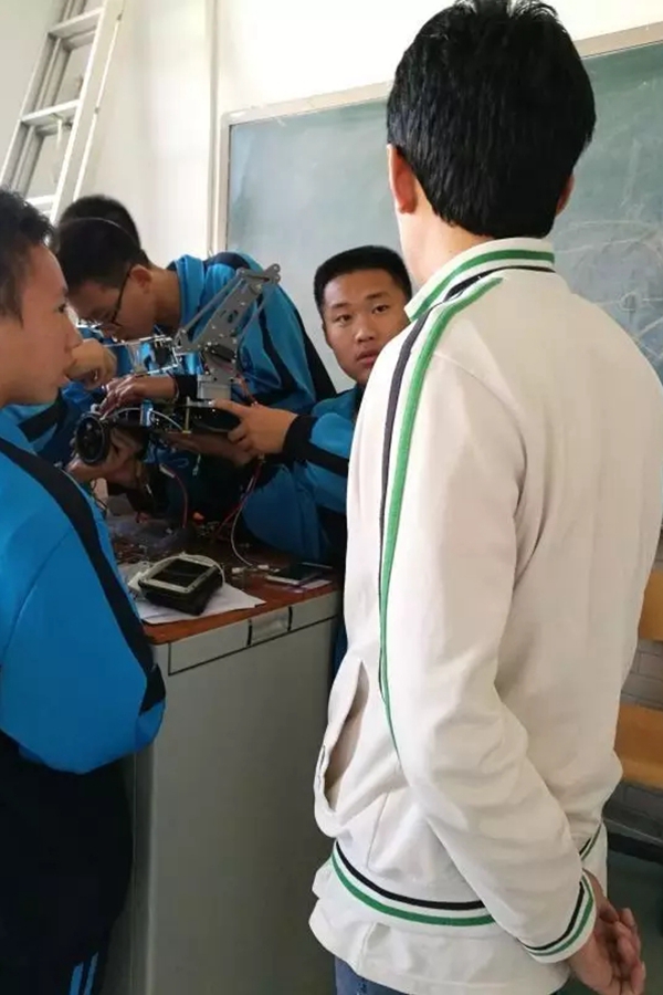 除了赵建伟老师每周四定时开课外,他的研究生们也会经常指导中学生的实践操作。研究生和高中生年龄差距不大,又有对机器人共同的爱好,很容易打成一片。