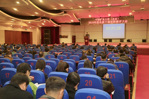本网讯 为深入贯彻党的十八届三中、四中、五中、六中全会以及习近平总书记系列重要讲话精神,认真落实教育部党组巡视组和选人用人专项检查组的反馈意见,全面、客观地掌握处级领导班子的工作计划执行情况和处级干部的政治业务素质、工作作风、履行职责和廉洁情况,促进干部干事创业的积极性和责任担当意识,2月28日,我校在科技会堂报告厅举行2016年度处级干部述职测评大会。校长杨仁树,副校长姜耀东,校党委副书记王忠强,副校长朱书全,校党委副书记、纪委书记张志坤,副校长范中启、王家臣出席会议。会议由党委组织部部长邹得志主持。