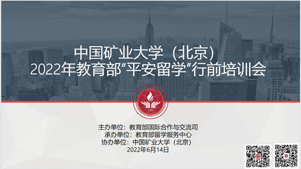 中国矿业大学(北京)始终高度重视“平安留学”行前培训工作,积极配合教育部国际司、教育部留服中心组织开展各类培训活动。今年的“平安留学”行前培训会践行教育部“平安留学、健康留学、文明留学、成功留学”的理念,紧扣“弘扬科学家精神,传承留学报国传统”专题,切实解答了留学人员所面临的困惑和疑虑,提升了他们在外期间的安全意识和适应能力,为广大矿大学子实现留学梦保驾护航,受到了与会学员们的一致好评。