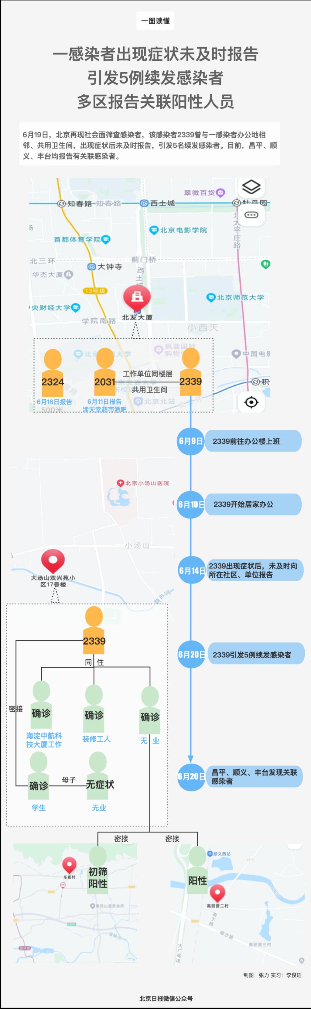 据北京疾控通报,该社会面筛查感染者2339,与6月11日通报感染者2031的工作单位在同一楼层(海淀区北发大厦),两人办公地点相邻,共用卫生间。6月9日感染者2339前往办公楼上班,6月10日起居家办公。该大厦连续检出两例阳性人员后(感染者2031、2324),未提供其大厦内所有公司人员的基本信息,致使感染者2339未被要求居家隔离,而仅是居家办公。因该感染者存在社会面活动轨迹,引发了社会传播风险。此外,该感染者于6月14日出现症状后,未及时向所在社区、单位报告,导致其未能被及早发现。截至目前,感染者2339已引发5名续发感染者。值得注意的是,目前,昌平、顺义、丰台均报告有关联感染者。