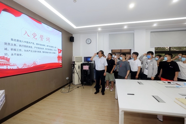 王家臣在讲话中首先祝贺黄磊、李玉麟同志转为正式党员,他结合中国经济发展史及出国亲身经历,勉励同学们要拥护中国共产党的领导,热爱祖国和人民。中国共产党的坚强领导是我们战胜一切困难的法宝,正是在党的坚强领导下,在老一辈共产党员的奋斗奉献中,我们才取得了一个又一个伟大的胜利。王家臣希望,同学们要以史为鉴、脚踏实地,在日后的学习科研生活中,不畏艰难、迎难而上,不断发现自我、丰富自我、超越自我,勇做新时代先进采矿党员先锋,实现人生价值。他肯定了党支部红色“1+1”活动方案,想法新颖,能突出专业特色,期待取得良好实践成果。随后,王家臣带领支部全体党员,庄严宣誓,重温入党誓词。