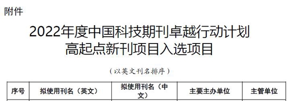 中国科技期刊卓越行动计划是为落实《关于深化改革培育世界一流科技期刊的意见》,由中国科协、财政部、教育部、科学技术部、国家新闻出版署、中国科学院、中国工程院联合实施,面向全国科技期刊系统构建支持体系,旨在加快建设世界一流科技期刊,夯实进军世界科技强国的科技与文化基础。其中,高起点新刊项目以域选刊、前瞻布局、突出引领,在传统优势、新兴交叉、战略前沿、关键共性技术领域创办高起点英文科技期刊。