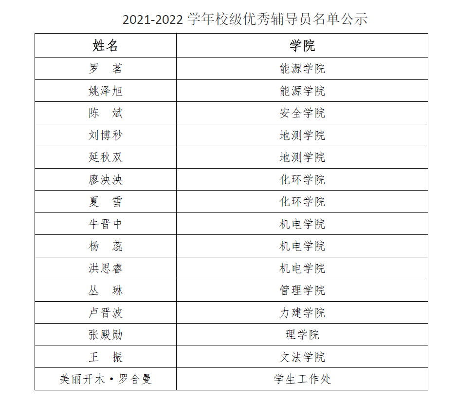 参与本次测评的辅导员共有60人,经测评统计,15名校级优秀辅导员候选人名次均位列总评人数的前20名,最终产生了2021-2022学年校级优秀辅导员名单,并在10月4日至10月6日期间进行网络公示。公示如下(按学院顺序):