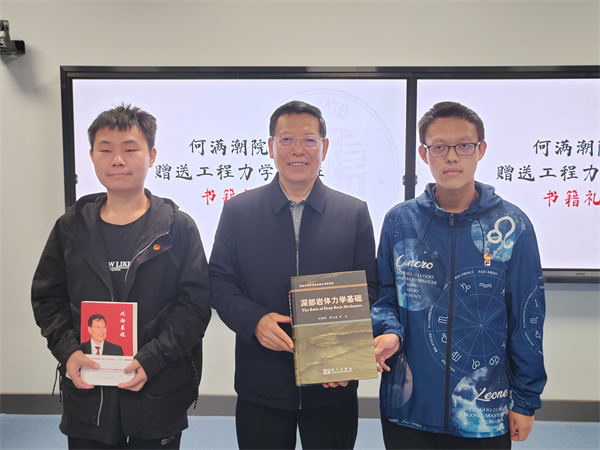 在答疑互动环节,同学们围绕入学一年来的专业疑惑、学习挑战和未来发展等方面踊跃提问,何满潮逐一耐心解答,指点迷津。何满潮题字赠送同学《深部岩体力学基础》和《风雨兼程——记何满潮院士创立深部国重三十周年》等著作。班级学生代表向何满潮赠送了由32名同学结合3D打印、激光雕刻技术手工制作的“N00”工法简易模型,祝福何院士身体健康,桃李天下。
