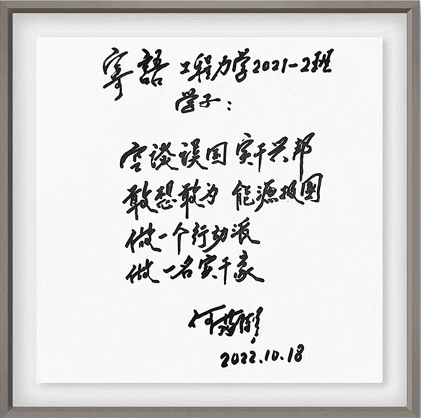何满潮强调,岩石力学的未来在中国,力学学子发展前景广阔,大有可为,要涵养大格局、大胸怀,眼光长远,不满足于小成功,勇攀大成功的高峰,而大成功靠的是挑战的难度,真正为社会做点贡献。他希望同学们时刻牢记将个人理想同国家发展紧密结合,爱党爱国、不负韶华、迎难而上、团结奋斗、当好模范班集体,踊跃投身祖国能源科技事业,建功新时代!最后,何满潮寄语同学们“空谈误国,实干兴邦,敢想敢为,能源报国,做一个行动派,做一名实干家!”