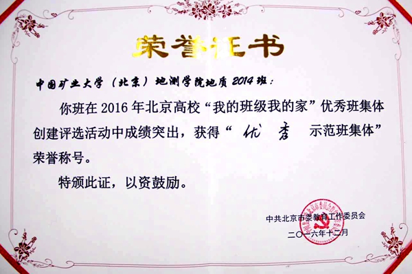 本网讯12月20日下午,我校地球科学与测绘工程学院地质工程2014班代表学校参加了由市教工委主办的2016年北京高校“我的班级我的家”优秀班集体展示评比活动。这是我校首次有班级入围,并成功获评“优秀示范班集体”。此次活动在北京工业大学知新园报告厅隆重举行,来自首都26所高校的优秀班集体参加了此次活动。