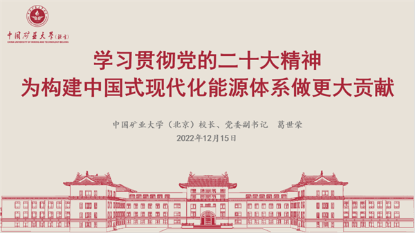 本网讯 12月15日下午,中国矿业大学(北京)举行学习贯彻党的二十大精神宣讲会。校长、党委副书记葛世荣作题为《学习贯彻党的二十大精神 为构建中国式现代化能源体系做更大贡献》的宣讲报告。学校全体副处级以上干部、全体党支部书记、师生党员代表线上参加。共计300余人参加会议。