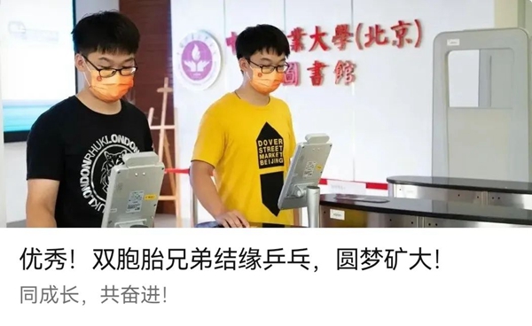 该通讯记录了考入中国矿业大学(北京)的一对双胞胎兄弟张洳铭、张洳豪,结缘乒乓,圆梦矿大的经历,以及他们在矿大的训练学习和成长收获,兄弟二人携手共进,互帮互助,不断进取,取得了优异的成绩。