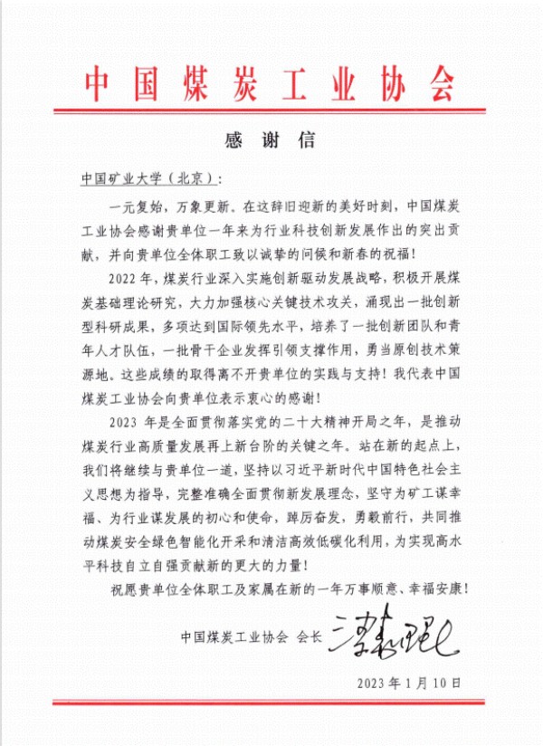 本网讯 日前,学校收到中国煤炭工业协会会长梁嘉琨署名的感谢信,对我校一年来为行业科技创新发展做出的贡献表示衷心感谢,向全体教职工致以诚挚的问候和新春的祝福,特别感谢学校对于煤炭行业基础理论、技术攻关与人才培养等方面做出的突出贡献。