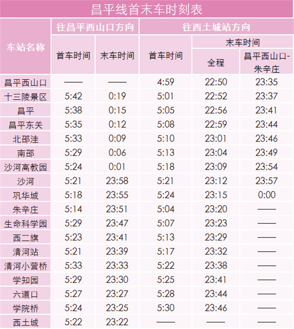 昌平西山口站(往西土城站方向)首班车时间为4点59分,全程末班车时间为22点50分,半程(昌平西山口站-朱辛庄站)末班车时间为23点35分;西土城站(往昌平西山口站方向)首班车时间为5点22分,末班车时间为23点22分。