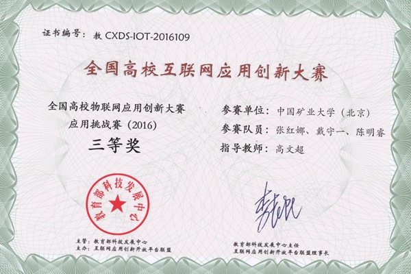 本网讯日前,第三届“全国高校物联网应用创新大赛”总决赛颁奖典礼在无锡高新区科技文化交流中心礼堂隆重举行。我校学生团队首次参加此项赛事,计算机系张红娜、戴守一、陈明睿和张家钊、黄靖东两支队伍获得了全国三等奖的好成绩。中国科学院院士、首届“未来科学大奖”获得者、清华大学副校长薛其坤教授,教育部科技发展中心主任李志民等出席颁奖典礼并为获奖同学颁奖。