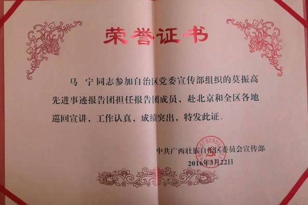 他还配合光明日报、人民网、新华网、广西日报和广西电视台等媒体跟进报道,成功将莫振高精神推向全国,活动的开展为莫振高校长成功入选“2015年感动中国十大人物”提供了坚强有力的支持,马宁个人也受到自治区党委宣传部的表彰。