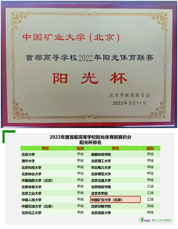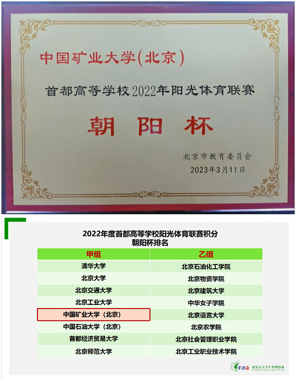 本网讯 3月11日,北京市大学生体育协会六届四次理事(扩大)会议在北京中影国际会议中心召开。我校获得北京市教委颁发的高等学校2022年度阳光体育联赛“朝阳杯”和“阳光杯”优胜校两项大奖。这是我校首次获得首都高校体育工作最高两项荣誉奖。