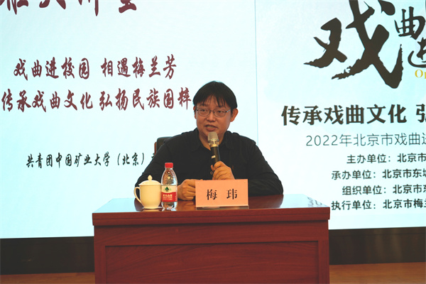 梅玮以《打开京剧之门》为主题,结合梅兰芳先生的表演作品,讲述了京剧的表演特点、唱腔特点、表演技巧及生、旦、净、丑各行当穿扮等。通过现场教授身段动作、戏曲台步、梅派手势等加深了大家对京剧表演的认识,以“知戏,感戏,听戏,看戏”的理念,让高校学子了解戏曲,走进戏曲。