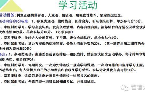 自2015年7月起的一年多来,管理学院党委重点抓好学生党员发展工作。以“讲规矩,听意见,重实践,长才干,纳人才,树典范”作为学生党员的发展思路,在以往单调的发展流程中融入更多的实践体验教育环节,除按照最新规范,将党员课堂教育分为“党支部教育、积极分子院级党课、发展对象校级党课”三级思想政治培养课程外,还以先锋连活动、党日活动为平台,通过素质拓展、志愿服务、体育锻炼、思想心得交流等模式丰富入党积极分子的培养与考察,加强团员与党员之间的沟通和交流。