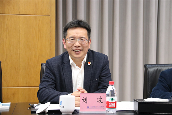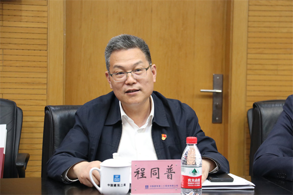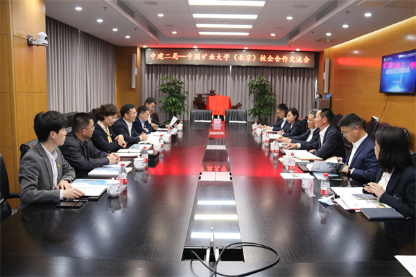程同普对刘波一行的到来表示热烈欢迎,他表示,近年来矿大(北京)与中建二局一直保持良好的合作关系,为公司输送了大批优秀的专业人才,为公司发展注入了强大动力。他结合公司“超越至上 唯实惟先”的超越精神,从行业有地位、发展有质量、品牌有彰显三方面对中建二局在核电、文旅、超高层、投资、海外项目、科技研发等业务板块进行了全面深入地介绍。他指出此次校企合作使双方迈出了共同发展的重要一步,希望未来双方在人才培养、课题研发、党建工作等方面进一步深化合作。