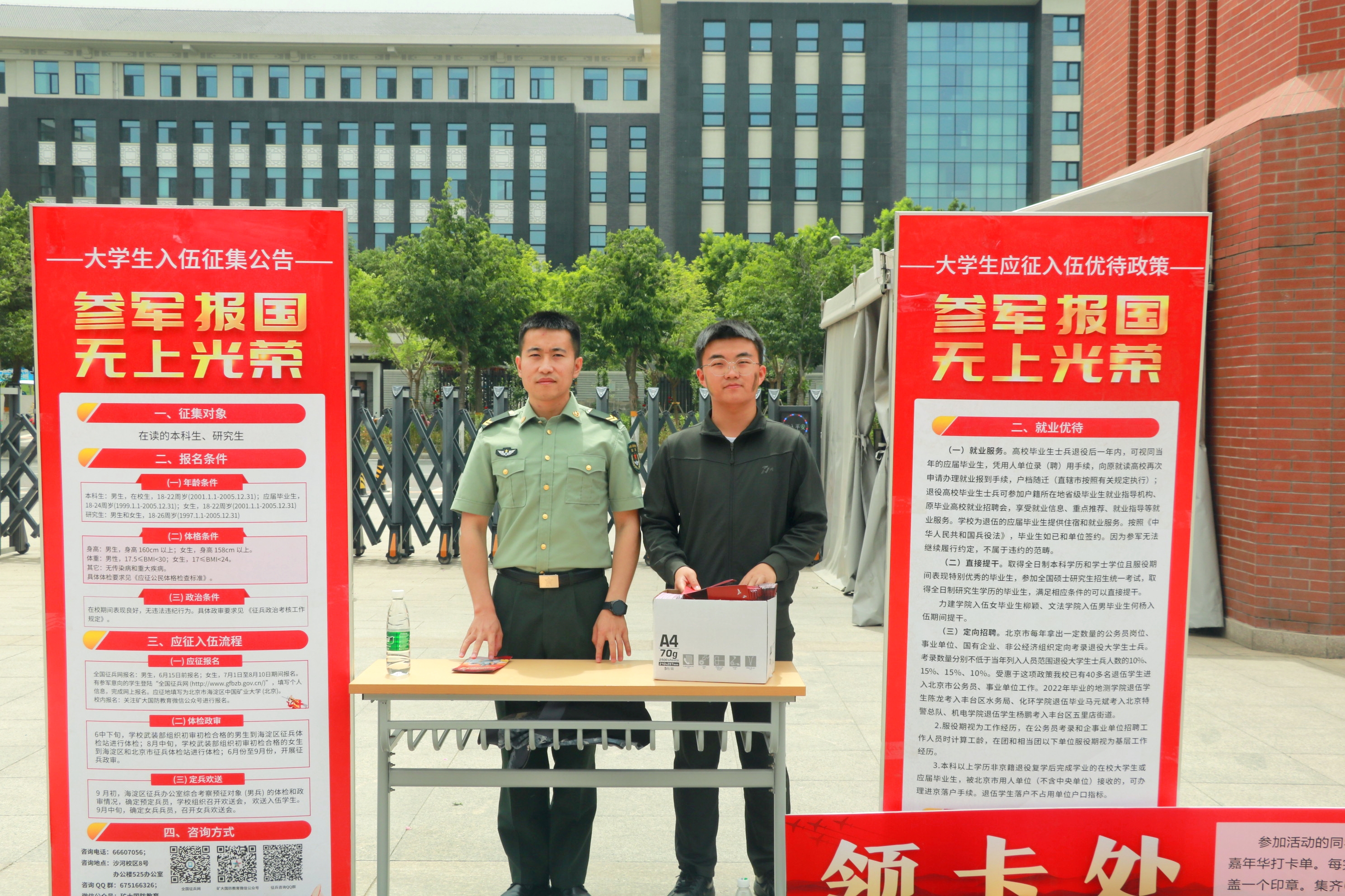本网讯 为深入开展学习贯彻习近平新时代中国特色社会主义思想主题教育,落实中共中央、国务院、中央军委印发的《关于加强和改进新时代全民国防教育工作的意见》要求,依据“围绕学生、关照学生、服务学生”的原则,增强学生的体验感、获得感,加强征兵宣传,5月20日上午,中国矿业大学(北京)国防教育嘉年华暨2023年秋季征兵宣传活动在沙河校区南广场举行。校党委副书记安宇,党委学生工作部、党委武装部副部长童军武、保卫处副处长刘国丰、各学院征兵工作负责老师、辅导员老师出席活动以及300余名学生参加了此次活动。