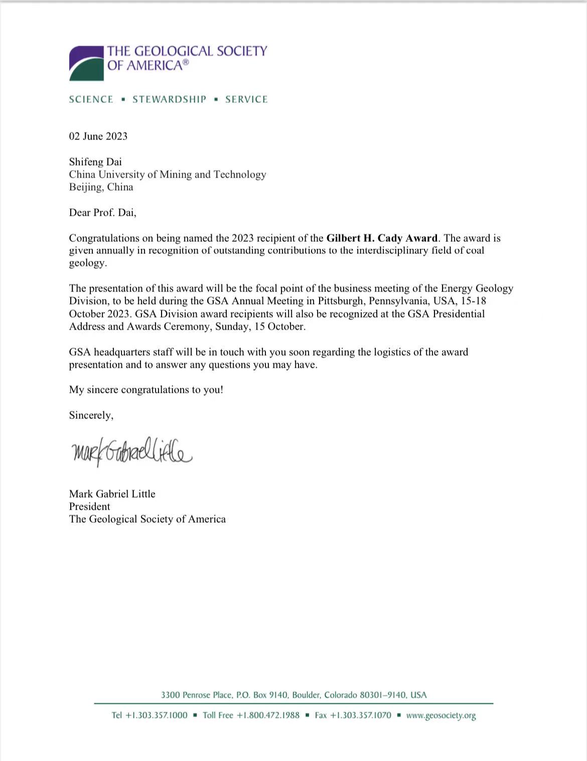 本网讯 6月2日,我校代世峰接到美国地质学会主席Mark G.Little教授的来函,祝贺代世峰教授获得Gilbert H.Cady奖。Gilbert H.Cady奖是美国地质学会(The Geological Society of America)设立的能源地质奖,用于表彰在煤地质学领域做出杰出贡献的科学家。通常情况下,该奖每年授予一位科学家。代世峰教授是该奖自1971年设立以来的第43位获奖者,也是第一位华人获奖者。此前获奖者主要来自美国,仅有2位获奖者来自澳大利亚、分别各有1位来自加拿大和西班牙。代世峰的获奖表明中国学者在煤地质学领域的研究在国际上产生了重要学术影响。该奖将在2023年10月15-18日美国地质学会年会大会上颁发。